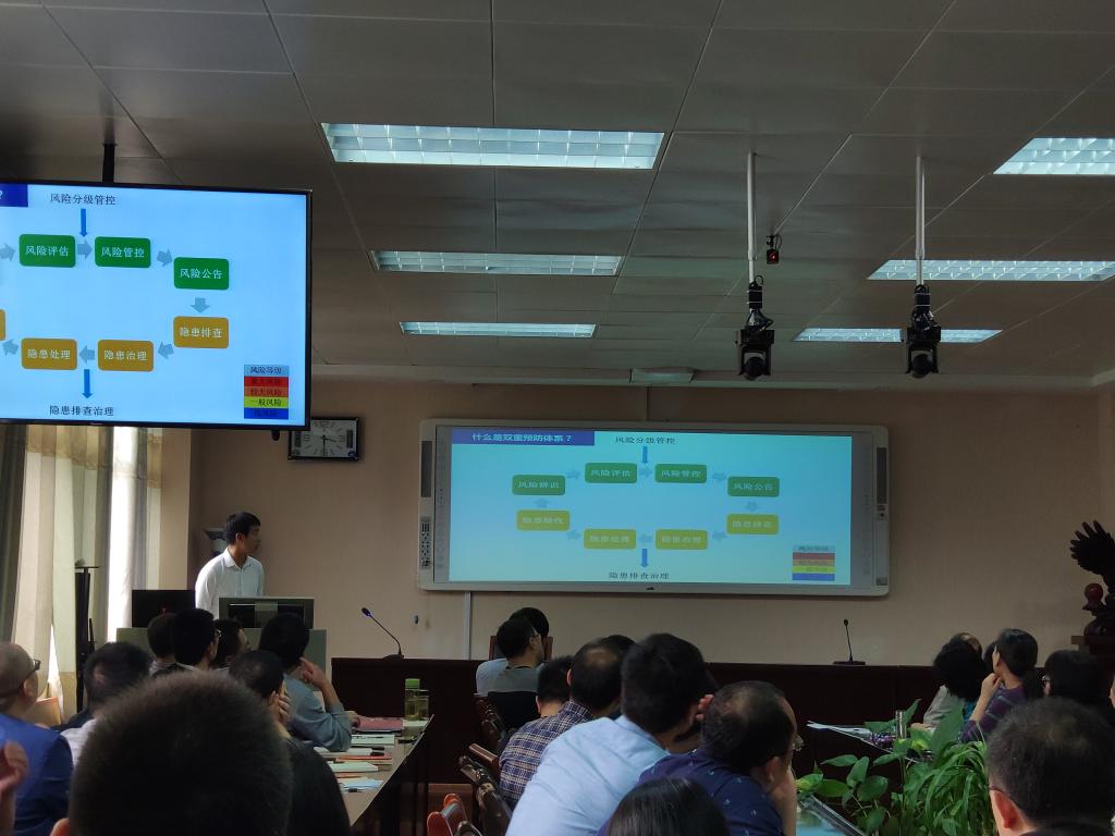 为了全面落实公司安全风险辨识管控与隐患排查治理双重预防体系计划内容的实施,伟的国际1946bv官网于9月29日下午特邀技术合作单位河南省新伯乐教育科技有限公司专业讲师在化学楼407学术报告厅召开了“伟的国际1946bv官网双重预防体系建设培训会”。会议由副经理归风铁主持。