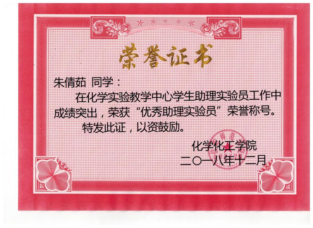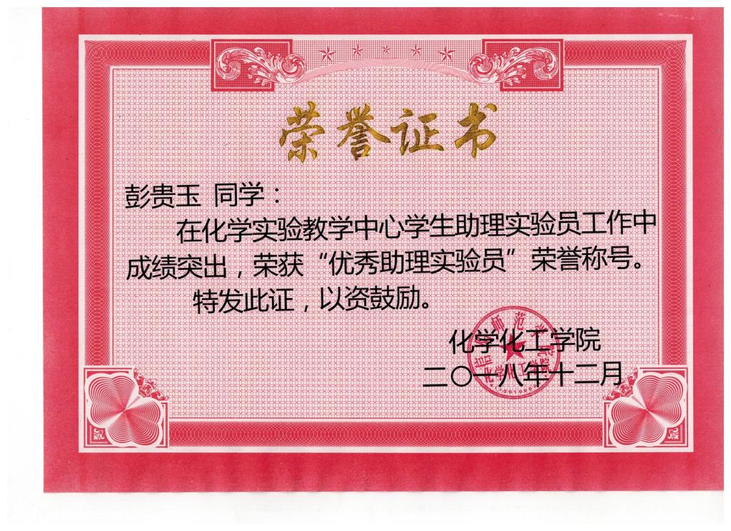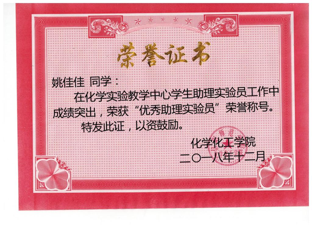 根据实践过程中的表现,经指导教师推荐、化学实验教学中心考核,姚佳佳、顾春燕、彭贵玉、罗浩天、朱倩茹等5位同学荣获“优秀助理实验员”荣誉称号,特此表彰,以资鼓励!希望同学们能在助理实验员的工作中切实得到锻炼,增强动手能力和科研能力。