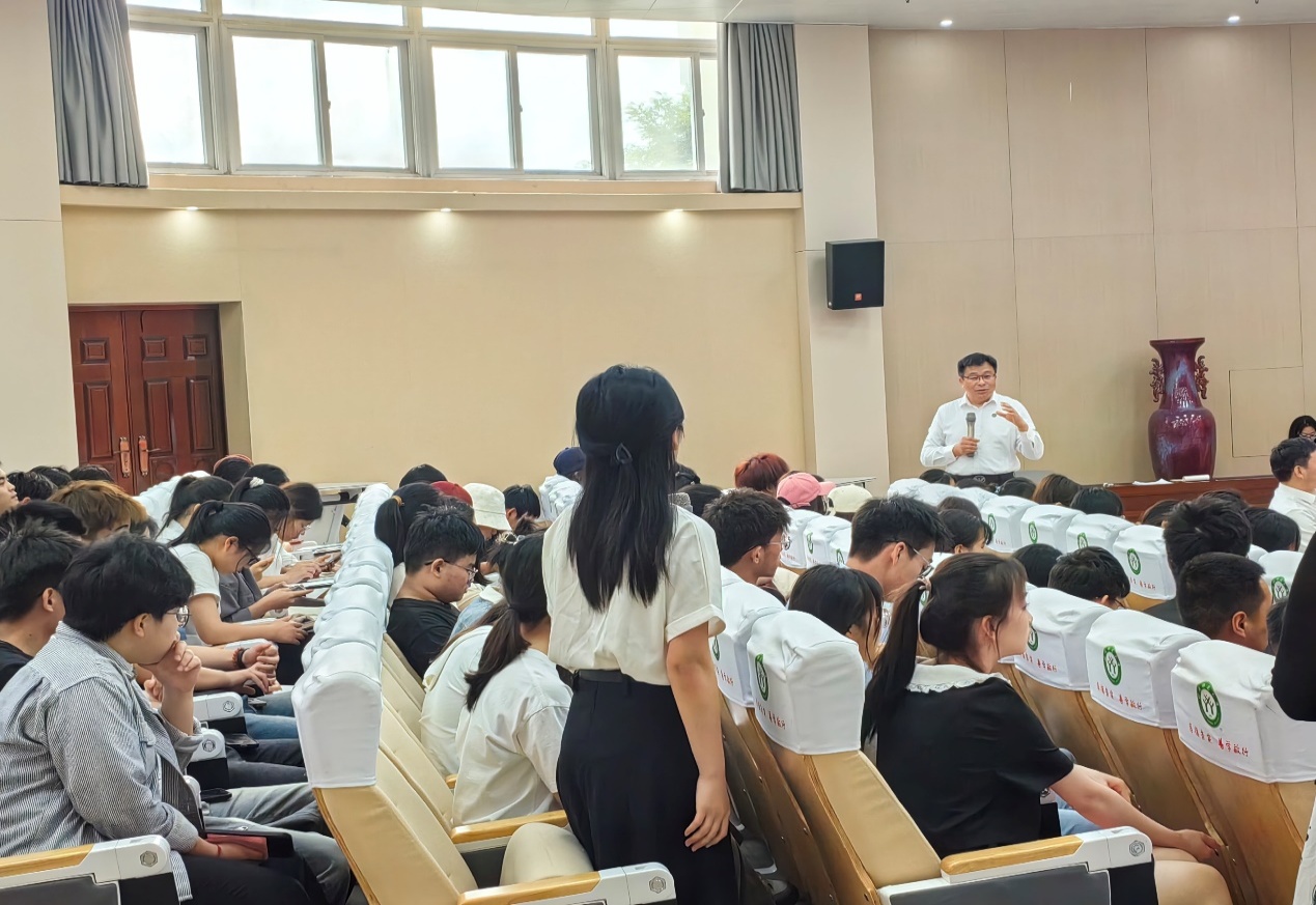 首先,邹亮忠结合自身求学、就业、创业丰富经历,为同学们讲解了化学学科发展的相关知识前沿、就业创业前景,强调了化学学科的重要性以及社会经济发展需求、相关专业人才的缺乏。他鼓励同学们要在大学四年生活中注重打好专业知识坚固基础,在日常学习生活中要有奋斗目标、要谦虚谨慎、要努力奋斗。其次,邹亮忠先生讲述了自身求学就业、创新创业的经历,并分享职场就业、创业人生一些经验:一是社会是有规则的,要积极适应社会;二是要提前了解自己热爱的职业并做好职业规划;三是坚持做好一件事力求有所成。接着,邹亮忠先生为大家分享自己关于求学和工作、做人和做事方面的独到人生见解。他提出“成功的标准是不给别人带来麻烦,作为一名老员工要做到独立,要有回报社会的感恩态度,要让别人因为我们的存在感到兴奋。”