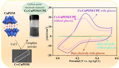 近日,公司曹新华教授课题组在无机化学领域知名期刊《Inorganic Chemistry》上发表了题为“Nanostructured Polyoxometalate-Based Heterogeneous Electrode Materials for Electrochemical Sensing of Glucose”(DOI:10.1021/acs.inorgchem.3c04596)的研究成果。该研究选用CsCl对水溶性K2Na8[Cu4(H2O)2(PW9O34)2](CuPOM)进行抗衡阳离子交换,得到形貌为光滑棒状的不溶性化合物CuPOM(Cs-CuPOM),再利用Cs-CuPOM对碳糊电极进行修饰(Cs-CuPOM/CPE),构建了电化学葡萄糖传感器。与Cs-MnPOM、Cs-FePOM及其它已报道的POMs基电极材料相比,Cs-CuPOM具有更快的电子传递动力学,展示出更高的电化学传感器活性,该项工作为开发高性能的葡萄糖传感器提供了理论参考。
