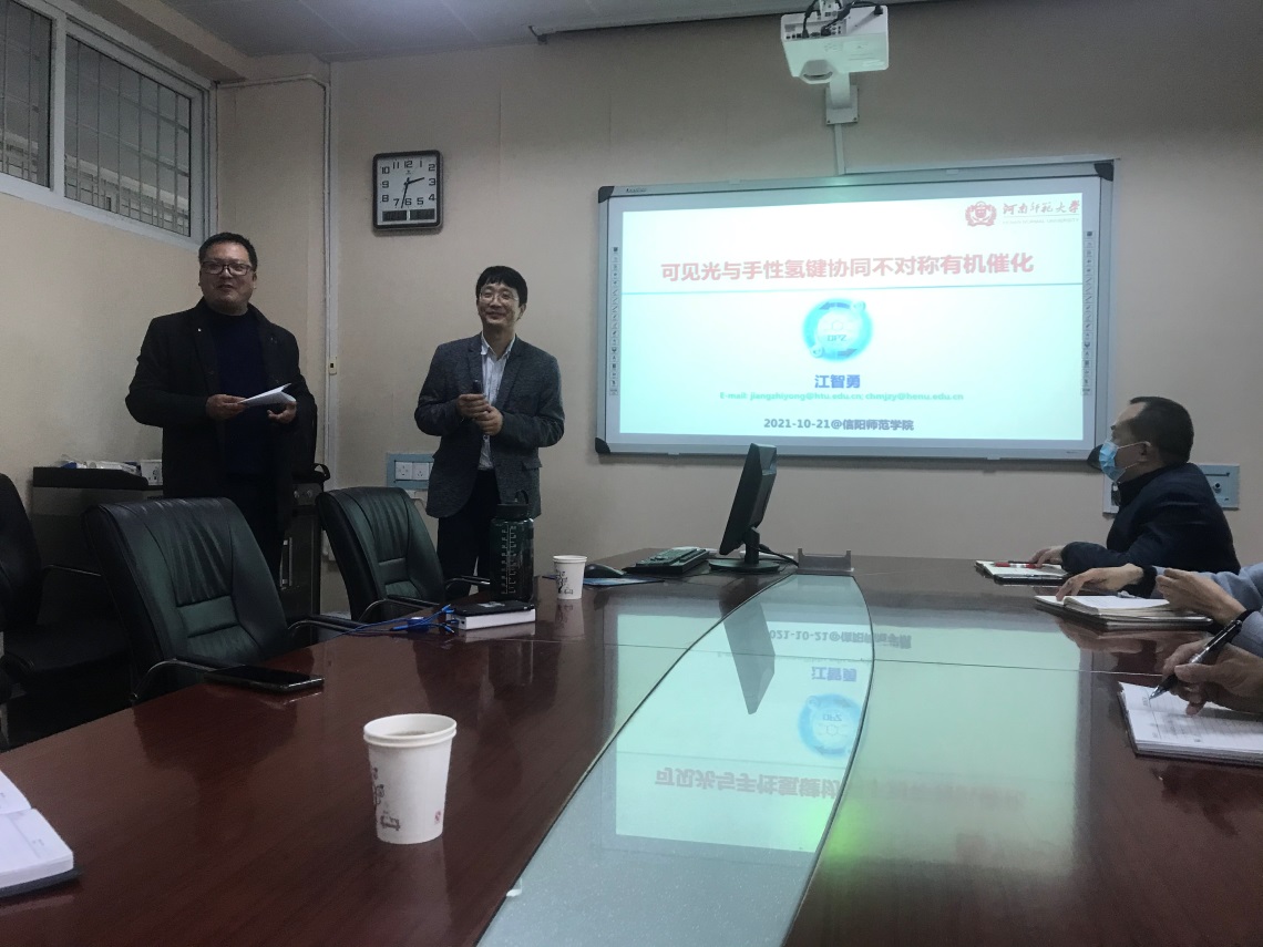 10月21日,应伟的国际1946bv官网邀请,河南师范大学江智勇教授在化学楼210会议室作了题为“可见光与手性氢键协同不对称有机催化”的学术报告,报告会由副经理曹俊涛主持,伟的国际1946bv官网部分青年教师和研究生参加了报告会。