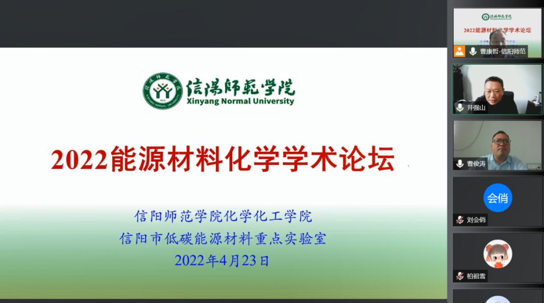 4月23日,由信阳师范公司伟的国际1946bv官网、信阳市低碳能源材料重点实验室承办的“2022能源材料化学学术论坛”线上会议成功召开,公司科技处处长兼伟的国际1946bv官网经理井强山教授做开幕致辞,来自南开大学、清华大学深研院等高校和研究院所的10位业内顶尖学者做大会报告,公司近百名教师和员工参会。
