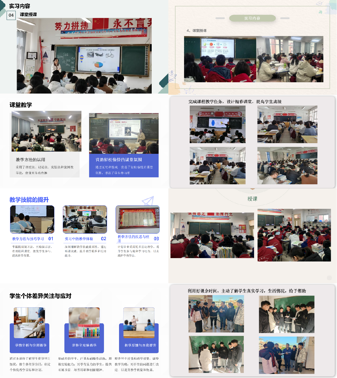 正值中学处于期末考试复习的关键阶段,为不影响实习中学正常的公司产品活动,2023级7位教育硕士精心录制了PPT电子讲稿,准备了文档材料,打包发送给各位专家老师,向大家汇报了在中学一线实习期间,在课堂教学、班级管理、教育调研等方面的丰富经历与心得体会,展示了自己在教学方法探索、课堂互动创新及班级管理等方面的成长和收获,彰显了出色的实践能力和反思意识。