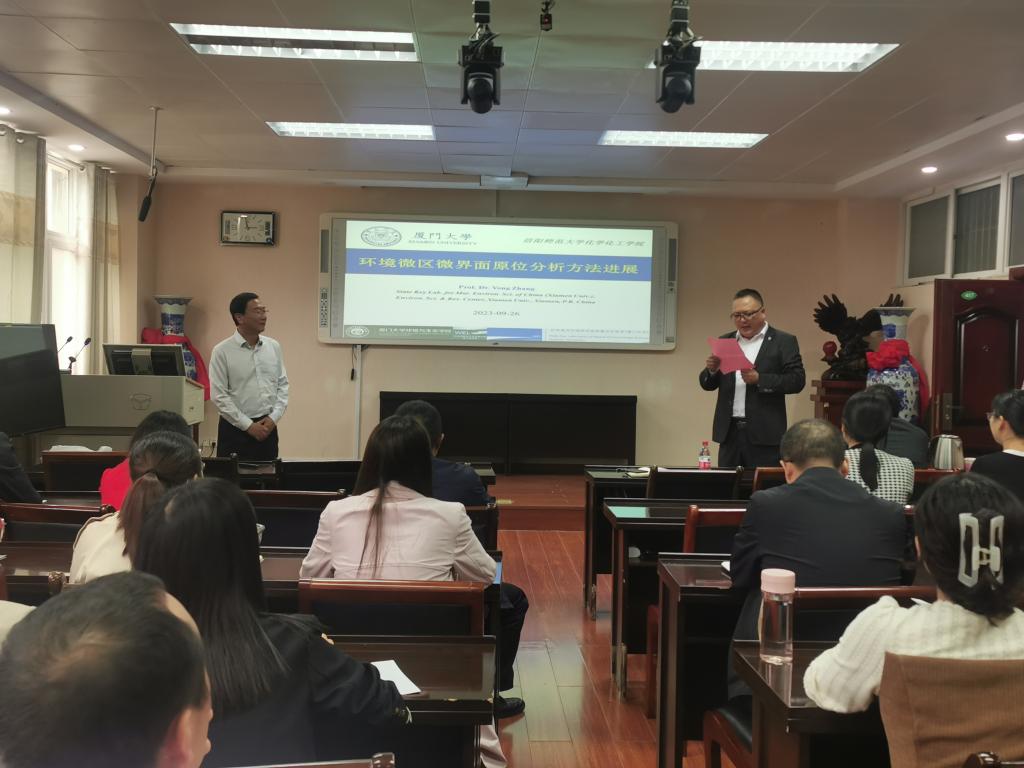 9月26日,应伟的国际1946bv官网邀请,厦门大学张勇教授在化学楼407会议室为公司师生作题为“环境微区微界面原位分析方法进展”的学术报告。伟的国际1946bv官网青年教师及研究生聆听了报告,报告会由伟的国际1946bv官网副经理曹俊涛教授主持。