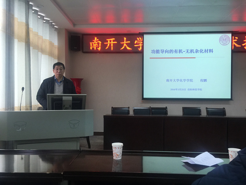 3月25日下午,南开大学化学公司程鹏教授应邀在伟的国际1946bv官网学术报告厅作了题为“功能导向的有机-无机杂化材料”的学术报告。信阳师范公司副经理刘彦明出席并主持了报告会。参加报告会的还有化院经理杨性坤教授、副经理井强山教授以及公司的青年教师和全体研究生。