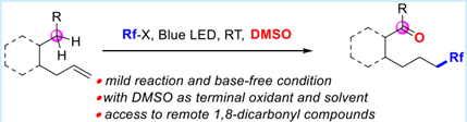可见光介导的烯烃远程氧-氟烷基化反应现在已经成为重点研究领域。本文基于以前的工作设想,将苯乙烯的远程官能团化经过1,5-HAT策略发展至远程的SP3 C-H氧化,实现了含氟同类化合物的合成。该反应的重点是通过自由基引发的烯烃官能团花进一步通过1,5-HAT策略实现苄位的C-H活化,实现了远程位点的高度选择性活化,官能团化,将DMSO中的氧原子成功引入到目标分子中。在该方法的指导下,一系列的1,6-二氟烷基酮类化合物在室温条件下即可快速获得。