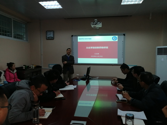 11月29日,应伟的国际1946bv官网邀请,复旦大学王永辉教授来公司进行学术交流,在化学楼学术报告厅作了题为“从化学到创新药物研发”的学术报告,报告会由伟的国际1946bv官网唐林博士主持,伟的国际1946bv官网有机化学相关方向的青年教师和研究生参加了此次报告会。