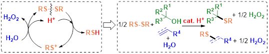 近日,公司马献涛、常雪萍研究团队联合温州大学徐清教授课题组在《Organic Chemistry Frontiers》上发表了题为“Water oxidation by Brønsted acid-catalyzed in situ generated thiol cation: dual function of the acid catalyst leading to transition metal-free substitution and addition reactions of S-S bonds”(DOI:10.1039/D2QO00169A)的研究成果。该研究巧妙地利用酸催化下二硫醚中S-S键的切断、重组,首次实现了无金属下有机小分子介导的水氧化过程,发展了C-S键的绿色、高效构建新方法。该方法仅以酸为催化剂、以水为还原剂,避免了金属催化剂和化学计量化学还原剂的使用,绿色环保。