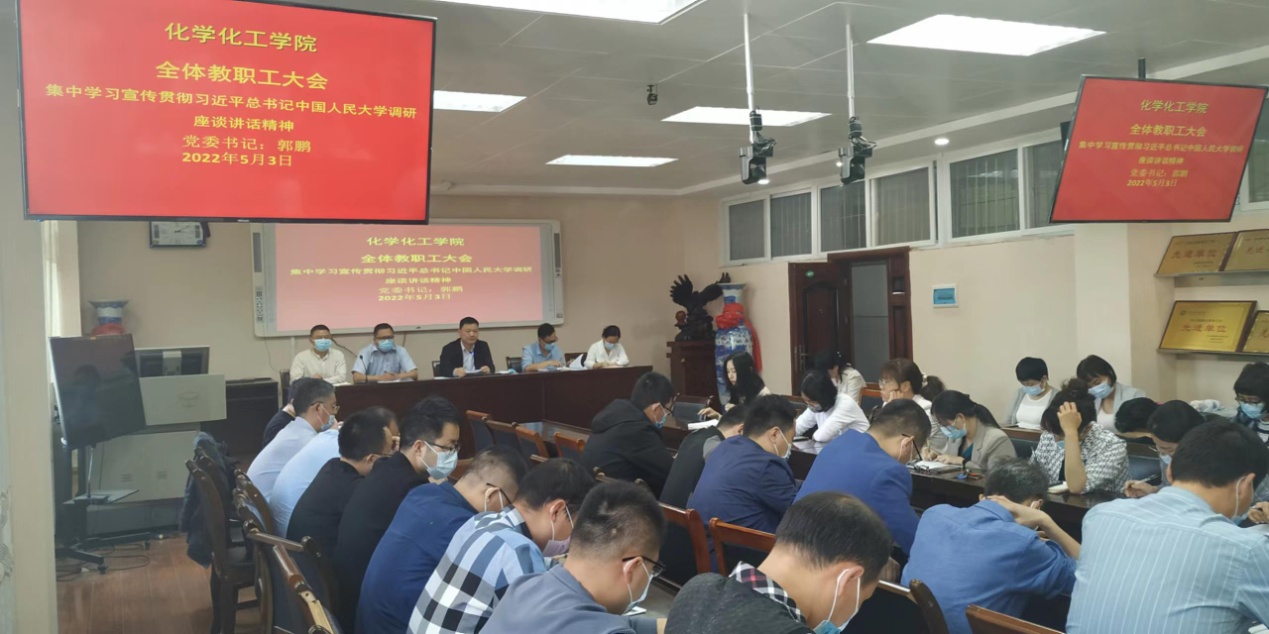 5月3日下午,伟的国际1946bv官网召开全体教师大会,专题学习传达贯彻习近平总书记在中国人民大学考察时的重要讲话精神。学习活动由党委书记郭鹏主持,全体教职员工参加了学习活动。