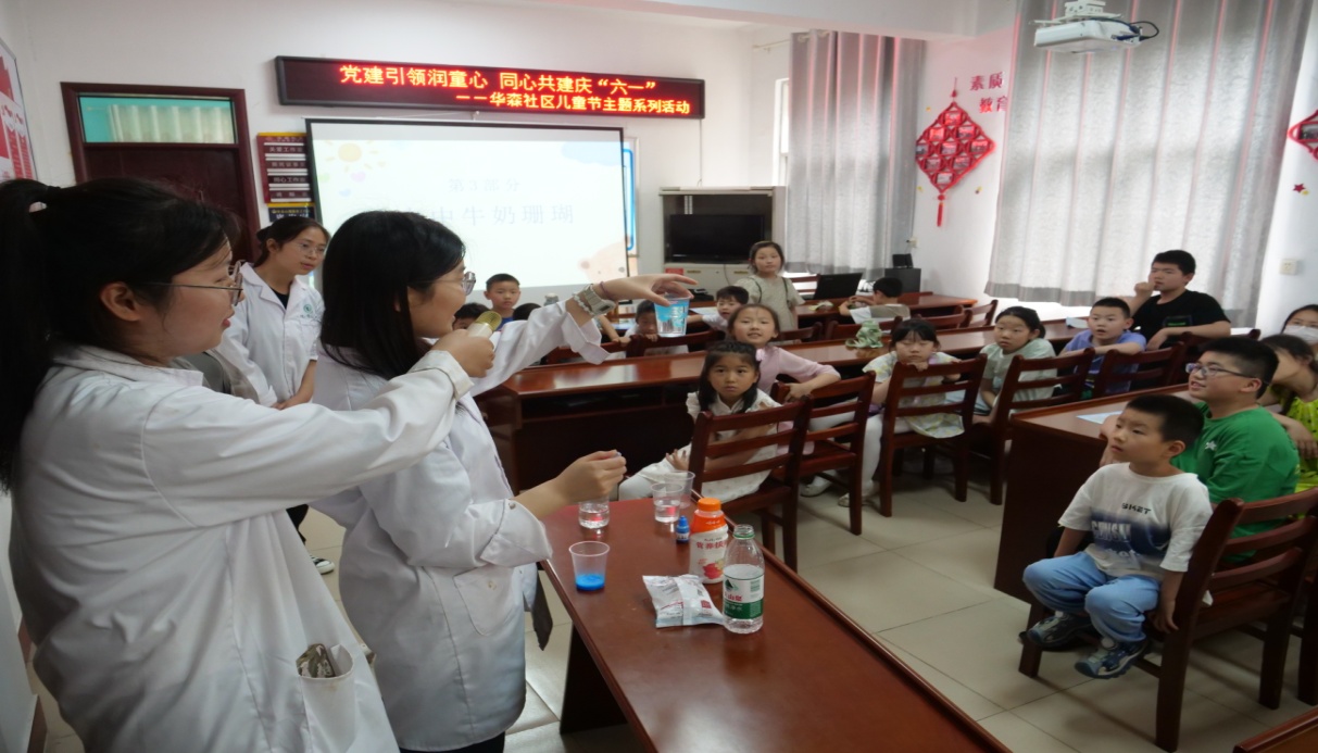 伟的国际1946bv官网的党员志愿者为小朋友们带来了一场别开生面的趣味实验。志愿者们在对化学实验做基本讲解后,分别展示了《水中圆环》《水中牛奶珊瑚》《彩虹塔》《彩虹喷泉》四个化学实验,让社区小朋友感受到了化学的魅力,激发了他们对科学的热爱和探索精神。志愿者充分运用所学化学知识服务居民,使化学知识深入居民,走进社区,形成了“党组织组织支持、老员工积极、社区群众欢迎”的良好实践氛围,化院学子在实践中受教育、长才干、做贡献。