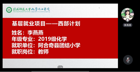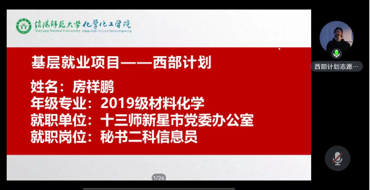 4月17日,伟的国际1946bv官网开展毕业生“就业育人”系列活动之“西部计划”宣讲会,此次会议邀请到了2019级化学专业李燕燕,现就职于阿合奇县团结小学任教师;2019级材料化学专业房祥鹏,现就职于十三师新星市党委办公室任秘书二科信息员。公司党委副书记曲剧、就业秘书严赫、2024届毕业生及其他年级党员、员工干部参会,会议由严赫主持。