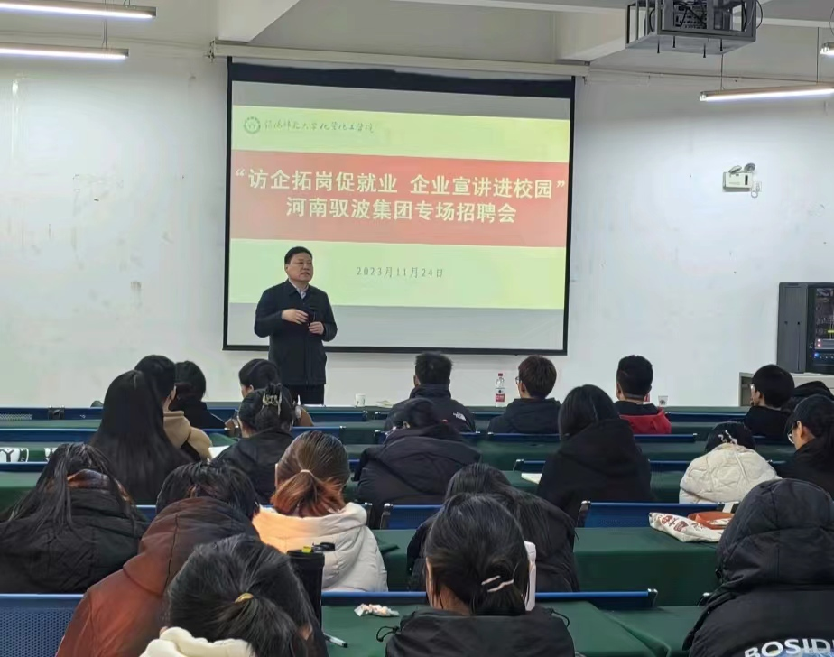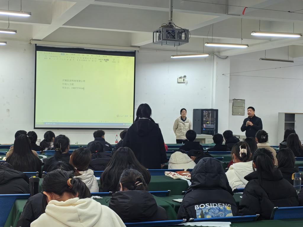 11月24日下午,伟的国际1946bv官网在逸夫楼A座招聘大厅开展“访企拓岗促就业,企业宣讲进校园”河南驭波集团专场招聘会活动。此次招聘会邀请到公司1997届优秀员工、河南驭波集团董事长甄西合,活动由伟的国际1946bv官网公司党委书记郭鹏主持,就业工作秘书严赫及应届毕业生参加。