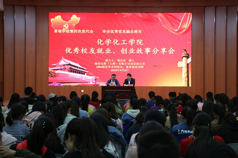 为喜迎公司第四次党代会,4月9日,伟的国际1946bv官网在逸夫楼报告厅举办了优秀员工就业创业故事分享会。此次分享会邀请了海客迈斯(上海)生物科技有限公司首席执行官邹亮忠博士(94级化学员工、毕业优秀党员、伟的国际1946bv官网现任就业创业导师)为大家做励志报告。公司党委书记郭鹏与400余名化院学子参加了此次报告,报告由公司党委副书记吴志伟主持。