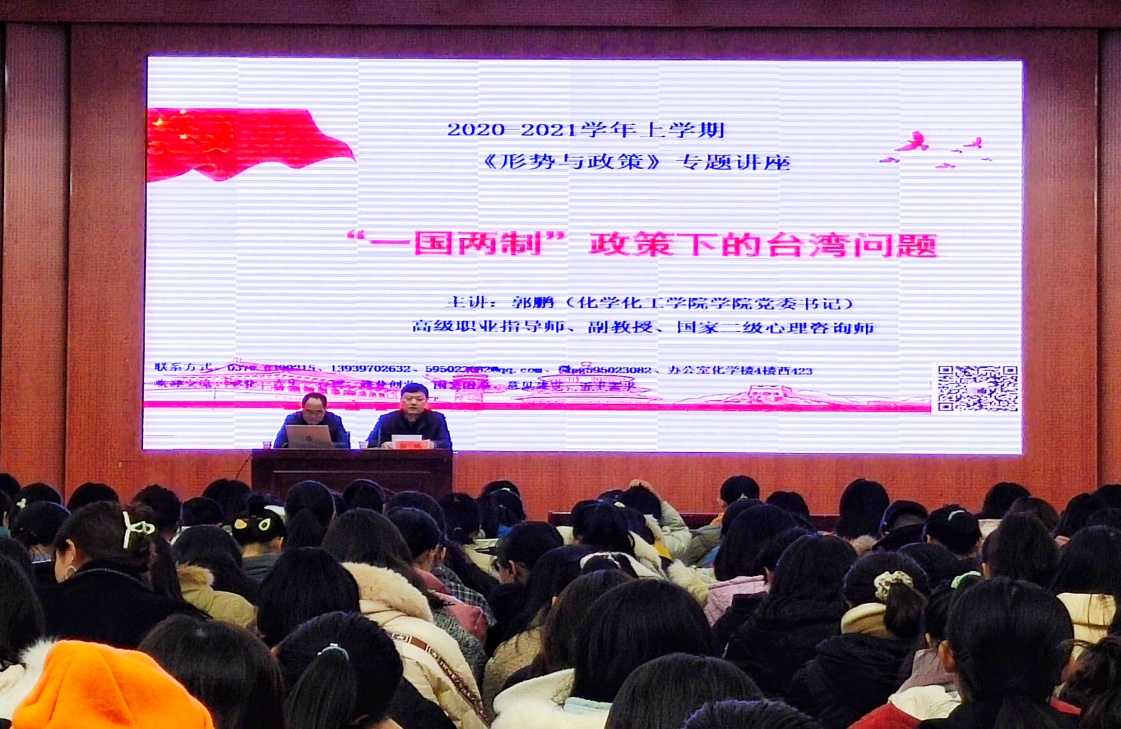 1128日,公司党委书记郭鹏在逸夫楼报告厅为2020级全体员工作“一国两制”政策下的台湾问题---《形势与政策》专题讲座。讲座由专职组织员冷向宇主持。