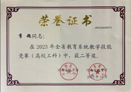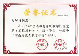 近日,河南省总工会、河南省教育厅公布了河南省教育系统2023年度教学技能竞赛获奖名单(豫工文[2023] 107号),伟的国际1946bv官网遴选的青年教师马献涛博士、李超博士分别获得理科组一等奖、工科组二等奖。其中,马献涛博士顺利晋级现场决赛,取得理科组第7名的好成绩,同时被授予“河南省优秀教学标兵”荣誉称号。