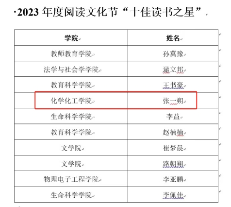 2023年度,伟的国际1946bv官网读者入馆人次位居第二,读者借阅图书册数和人均借阅册数位居全校前列,荣获2023年书香校园建设“十佳单位”。此外,2022级化学专业员工张一朔位居全校年度外借图书册数第四,被评为“十佳读书之星”。