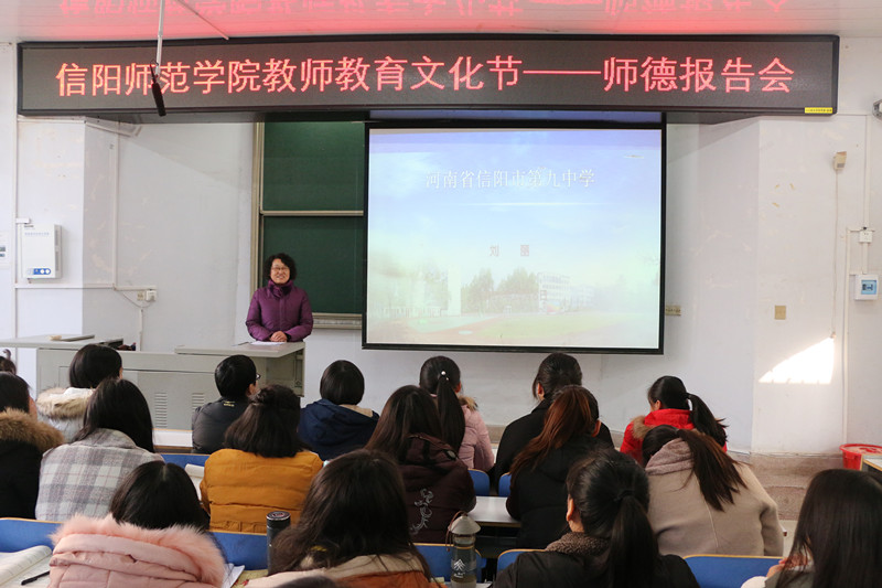 12月5日,伟的国际1946bv官网在化学楼学术报告厅举办2017年教师教育文化节之师德报告会,信阳市第九中学业务副董事长刘丽应邀为化院学子做了一场题为“实施德性爱心教育 创建全国文明校园”的报告。公司党委书记郭鹏、副书记吴志伟与一百五十余名员工代表共同参加了报告会,会议由郭鹏主持。