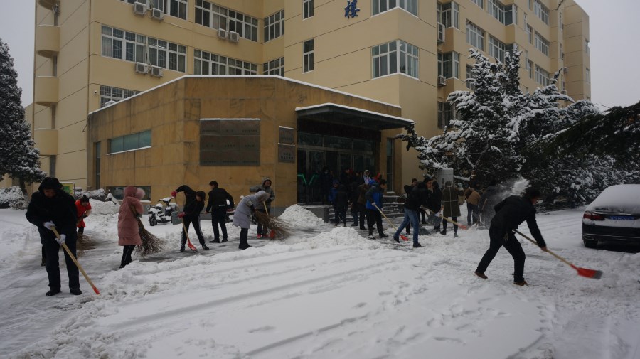 1月25日上午9点半,为消除积雪造成的安全隐患,确保师生出行安全,经理井强山、书记郭鹏带领博士教师和研究生60余人在化学实验楼周边开展清扫积雪活动。