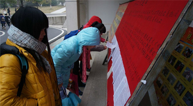 经过层层的篩选,最终于12月9日评选出若干篇优秀文章在化学实验楼前供同学们鉴赏。一篇篇激昂的文章,书写着那风雨飘摇,山河破碎的峥嵘岁月,还有那不灭的爱国情怀和不朽的民族精神。无数老员工义无反顾投身于火热的革命,他们的心激烈的碰撞着,发出一二·九运动的呐喊,刮起抗日救国的旋风。同学们在文章中说到,一二·九运动是经霜饱雨而永不垂头的花朵,记载国人的无畏,渗透民族的血泪和辛酸。一二·九运动不仅仅是爱国运动更是英勇筑成的坚实力量,撑起民族未来的抗日运动。此时的文字已化为点点感人心弦的画面,吸引无数同学驻足观看。