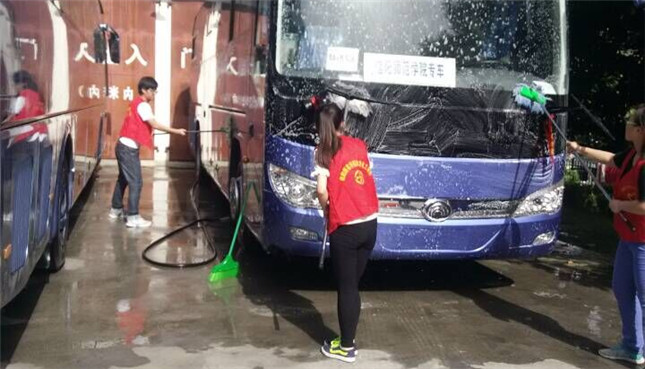为弘扬雷锋志愿服务精神,营造一个良好的乘车环境,6月5日,伟的国际1946bv官网爱心服务社在正门组织开展“公益洗车”活动,组织社团成员义务清洗校车。