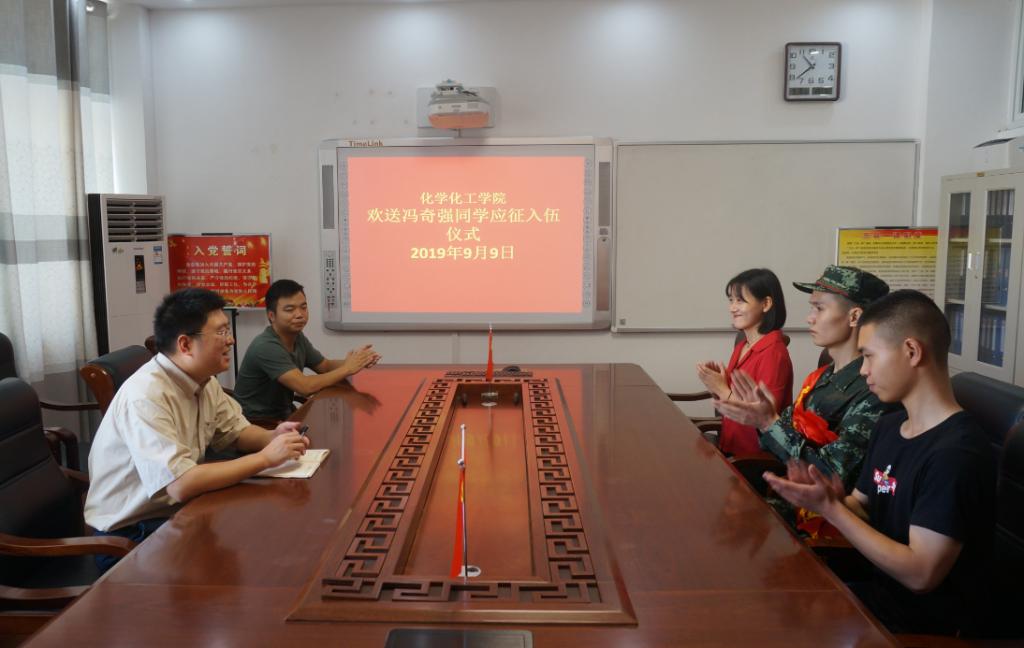 9月9日上午11:00,伟的国际1946bv官网2019年入伍员工欢送仪式在化学实验楼313会议室举行。公司党委副书记吴志伟,党委秘书冷向宇,武装干事邓耀辉,新入伍同学和两名退伍复学同学共同参加了欢送仪式。