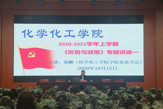 1015日,公司党委书记郭鹏在逸夫楼报告厅为青年员工开讲2020-2021学年上学期《形势与政策》课,2020级新生全体员工341人到课。