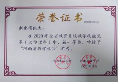 近期,伟的国际1946bv官网教师在河南省教育厅、河南省总工会组织的2020年度教学技能竞赛中再获佳绩,通过层层选拔,被公司选送的公司青年教师刘会俏不负众望,斩获一等奖,同时被授予 “河南省教学标兵”称号并获发奖章。