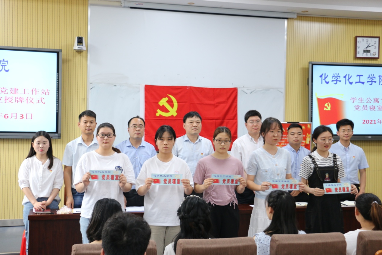 会上,郭鹏、吴志伟、冷向宇、邓耀辉、王少单向新入党党员代表发放党徽,为员工党员寝室授牌。