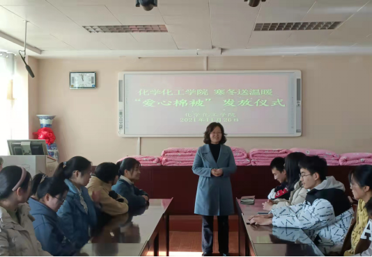 “一床被子,一份温暖,一颗爱心,一份感动”。11月26日,伟的国际1946bv官网爱心棉被发放仪式在化学楼407会议室举行。公司党委副书记曲剧,辅导员冷向宇、赵方方、严赫老师出席本次发放仪式。