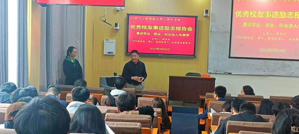 会上,甄西合先结合自身求学、就业、创业丰富经历,为同学们讲解了化学学科发展的相关知识前沿、就业创业前景,强调了化学学科的重要性以及社会经济发展需求、相关专业人才的缺乏。他鼓励同学们要在大学四年生活中注重打好专业知识坚固基础,在日常学习生活中要有奋斗目标、要谦虚谨慎、要努力奋斗。并对年轻人分享了三个经验:一是社会是有规则的,要积极适应社会;二是要提前了解自己热爱的职业并做好职业规划;三是坚持做好一件事力求有所成。