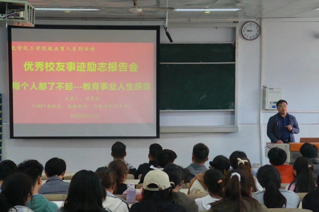 4月1日,伟的国际1946bv官网在教6-101多媒体教室举办“每个人都了不起---教育事业人生感悟”优秀员工事迹励志报告会。报告会邀请到伟的国际1946bv官网1997届优秀员工、河南省实验中学高级教师刘金武。报告会由公司党委书记郭鹏主持。2022级公费师范生、化学专业员工代表到会聆听并互动交流。