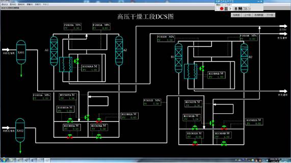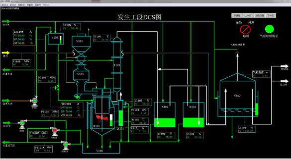 本仿真软件是以南通天源气体公司为原型,主要模拟的工段有乙炔气发生工段、净化工段、压缩干燥工段、充装工段以及丙酮补加工段,该软件既可以进行生产操作练习,也可以进行安全演练,仿真模拟。电石加入到装有水的发生器内,与水反应生成乙炔气与部分杂质气体;产生的混合气体送入气柜后,进入到净化塔中除去杂质气体,再经压缩机加压后进入分子筛干燥器进行深度除水,除水后送入充装工段充装进钢瓶内。